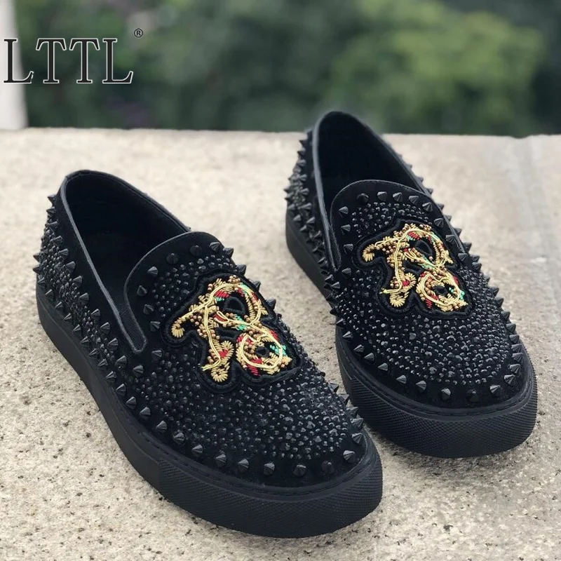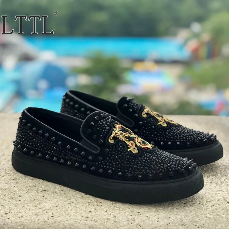 LTTL Black Rhinestone Mens Loafers Leather Low-cut Sneakers With Spikes Embroidery Lofer Shoes Man