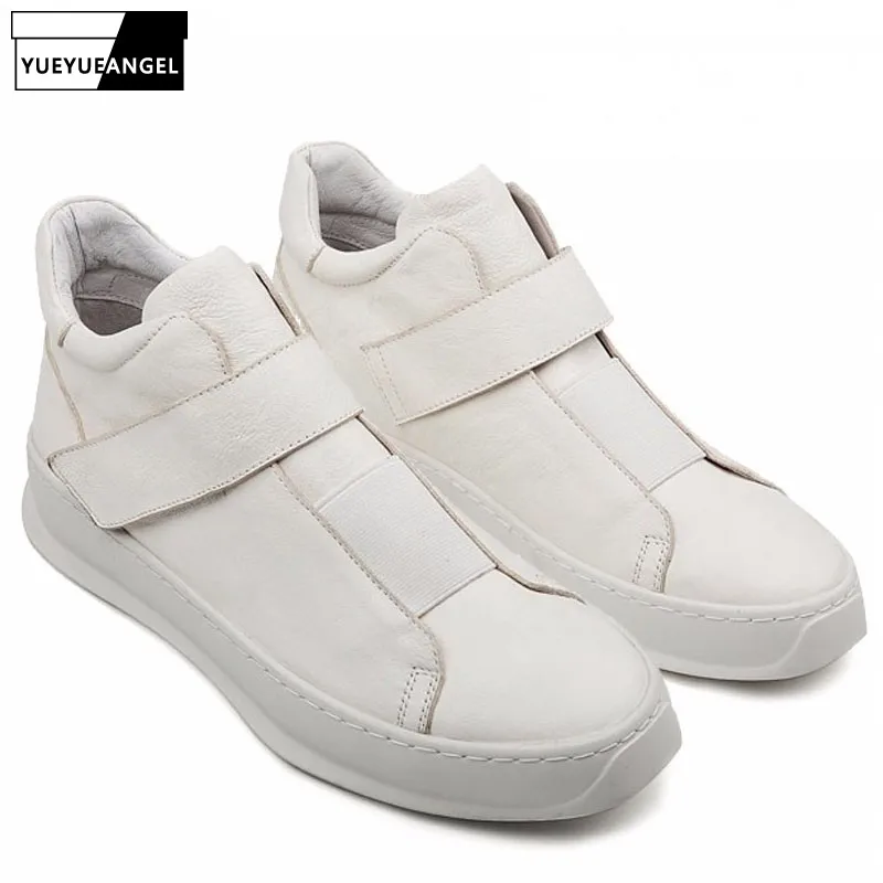 Vintage White High Top Flat Shoes Men Winter Round Toe Hook & Loop Genuine Leather Ankle Shoes Hand